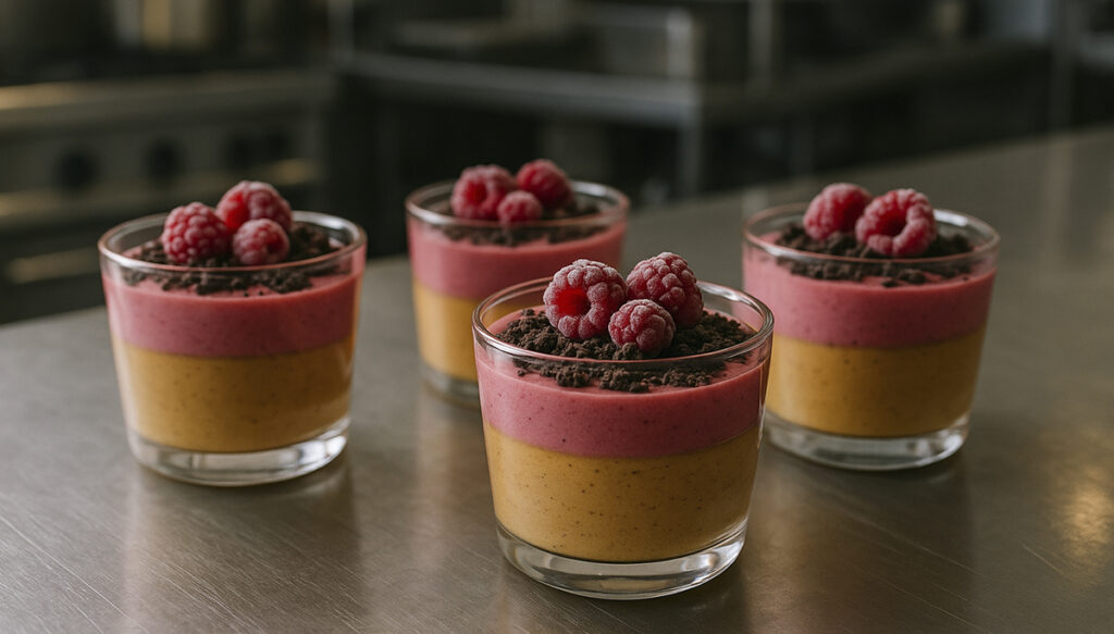 - Top layer of raspberry foam or whipped ganache.